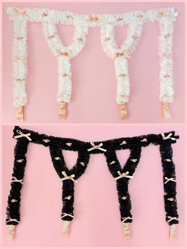※ガーターベルト1点の価格です。(写真1枚目参照)その他お揃いのアイテムは別ページからどうぞ。 ※受注商品の為、お届けまで一か月半頂きます。 ♡Whip Frill -Topping Lingerie- ♡Whip frill Garter belt/ガーターベルト ♡color:WHITE/BLACK ホイップクリームのようなレースのフリルに、薔薇のモチーフとリボンを散りばめたロマンティックなランジェリー。 トッピングするように身体装飾をお楽しみ頂けるシリーズです。 フェティッシュでありながら、少女趣味な可愛さがぎゅっと詰まったデザイン。 柔らかくゆったりとした着け心地で、お洋服の上から飾るように着けても可愛いです。 もちろんガータークリップは実際にソックスを留めて頂けます。 フリルレースは全て伸縮性がありますので、優しくフィットしてくれます。 (ウエスト周りはアジャスターで調節が可能です・サイズをご確認下さい) お揃いで着けられるアイテムも別ページで注文受付しております。 〇サイズ ※最大数はストレッチを伸ばした状態の値です。 ・ウエスト:約65㎝~78㎝(※最大110㎝) ・ガーターストラップ:約30㎝~最大55㎝ ・フリル幅:約4㎝ ☆サイズオーダーのご相談もお気軽にどうぞ。 〇仕様 フリルレースはゴムで伸縮性があります。 ウエスト周りも伸縮するストラップとアジャスターで調節可能。 金属製アジャスターで、サイズの調節も可能となっております。 〇配送について ・ご注文確定後(ご入金確認後)からお届けまでは約一か月半程頂きます。 ・もし早期発送をご希望の場合は、必ず注文前にご相談下さい(ご希望に添えない場合がありますのでご了承下さい。) ・発送方法:レターパック・又はゆうパック《送料無料につき その他の変更不可》 (ご一緒に即納商品をご注文された場合は即納商品を先にお届け致します。) 〇お手入れについて ・おうちでお手入れする場合、ぬるま湯で優しく手洗い、自然乾燥してください。洗濯洗剤を使用する場合も、ぬるま湯に溶かして手で優しく汚れを落としてください。その際、色落ち・色移りにご注意ください。洗濯機を使用する場合は、必ずネットをご使用下さい。 ※必ずサイズやカラーをご確認の上、ご注文お願いします。 ※1つ1つカラー・パーツ・形状が異なりますので、こちらも合わせてご確認下さい。 ※1点ずつ手作業での製作になりますので、多少の誤差が生じる場合がございます。ご了承ください。 ※また、光の関係で写真と実物の色合いが多少異なる事がありますことを、ご理解の上ご購入下さい。 〇ホイップフリルシリーズ ・ハーネスブラ https://milhae.theshop.jp/items/89350438 ・ガーターベルト(本ページ) ・エプロンスカート付ガーターベルト https://milhae.theshop.jp/items/89350319 ・ガーターバンド https://milhae.theshop.jp/items/89350586 ・フリルカチューシャ https://milhae.theshop.jp/items/89350755 ☆左上メニューからショッピングガイドをご覧の上、お振込・発送に関してご了承頂いた場合のみご注文をお願い致します。