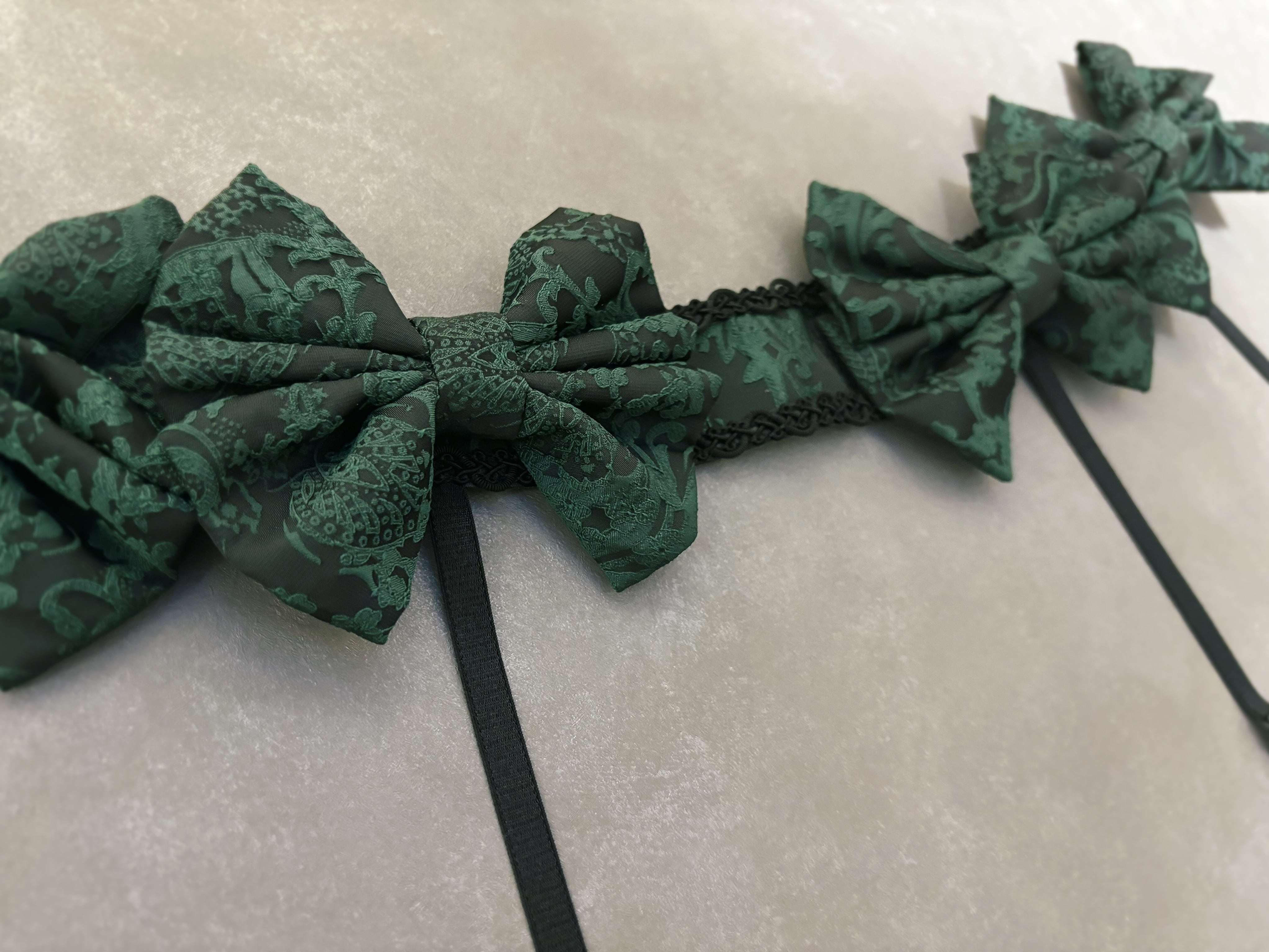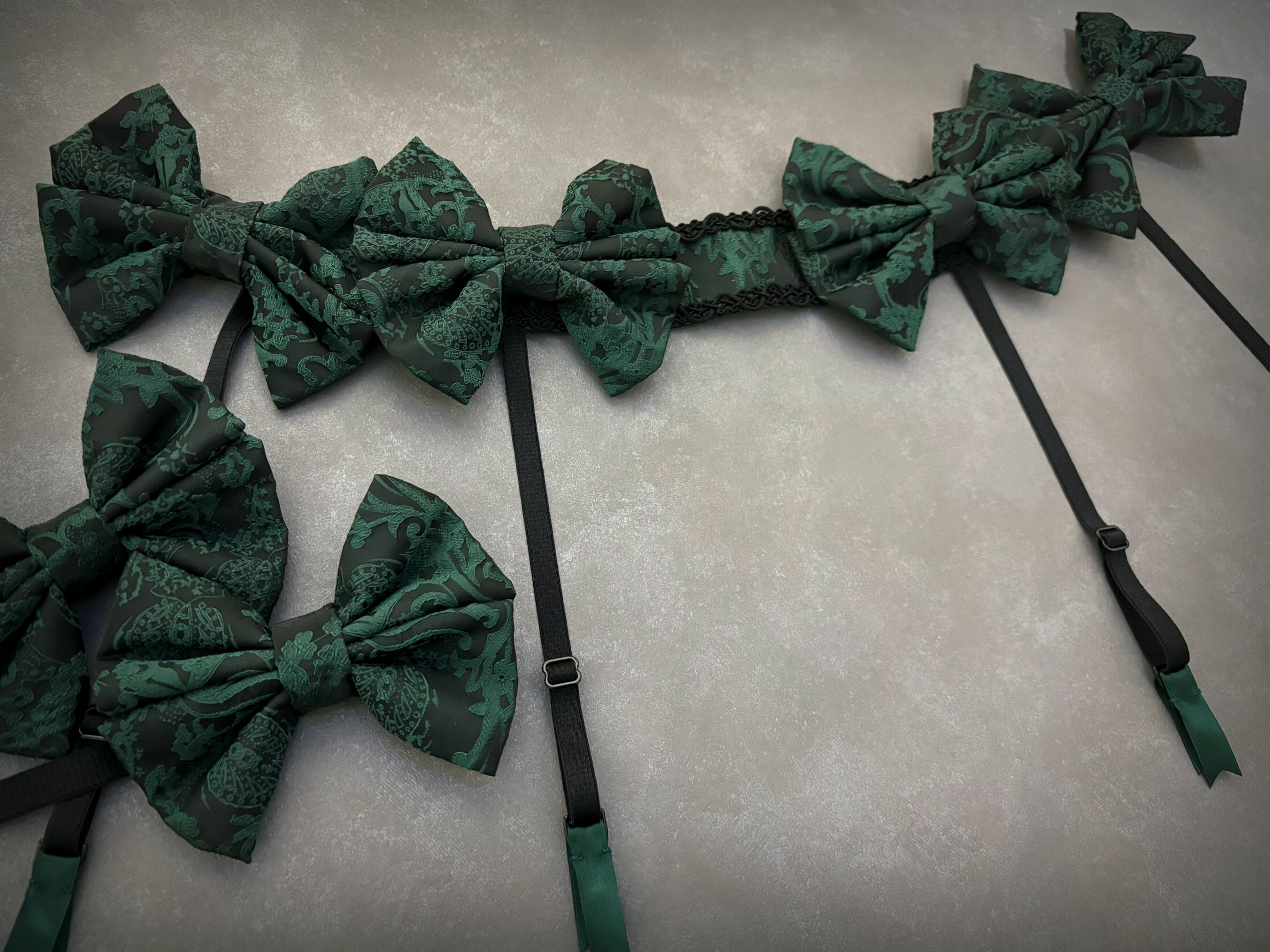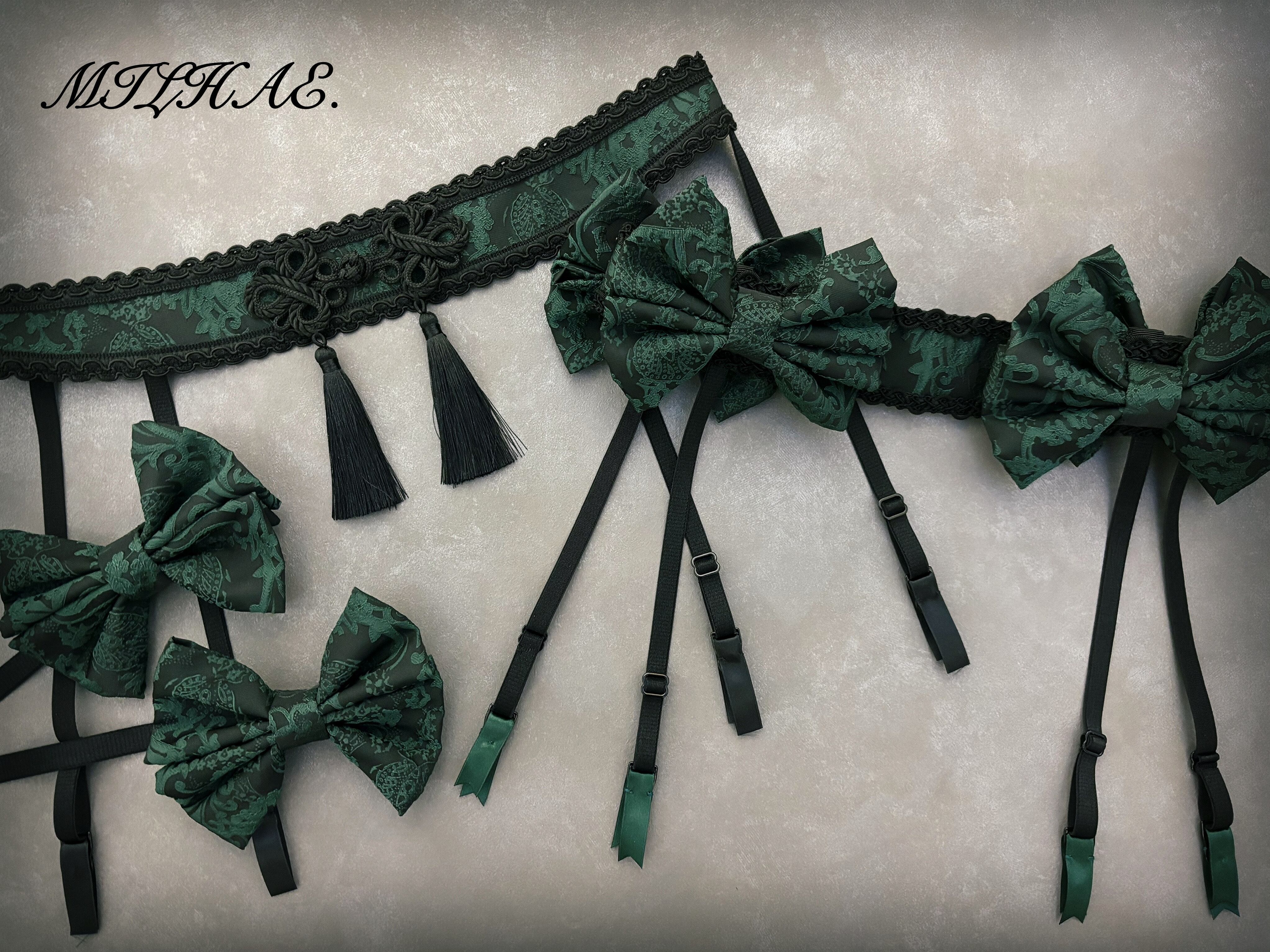 グリーン×ブラックのカラーがシックで可愛い、オリエンタルなダマスク柄のジャガード生地をガーターベルトに仕立てました。