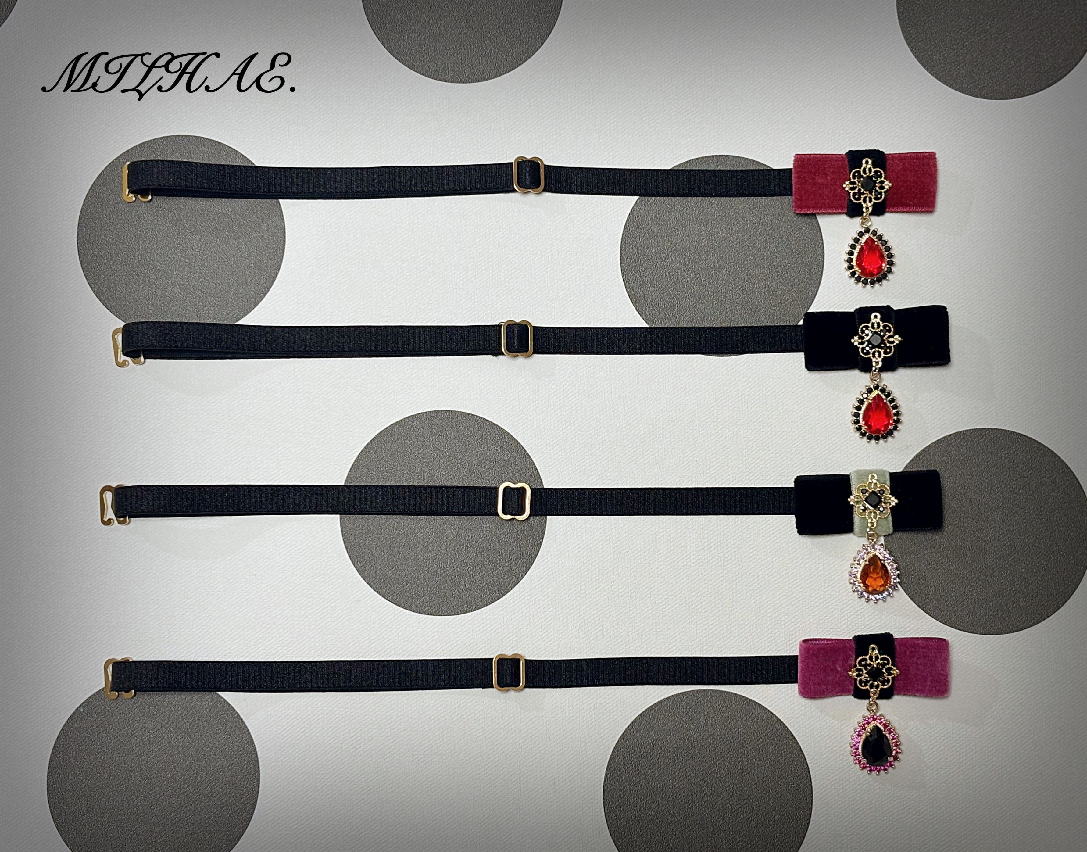 太ももやふくらはぎ、足首まで、お好きな位置で留められる仕様です。(チョーカーとしてもお使い頂けます。)