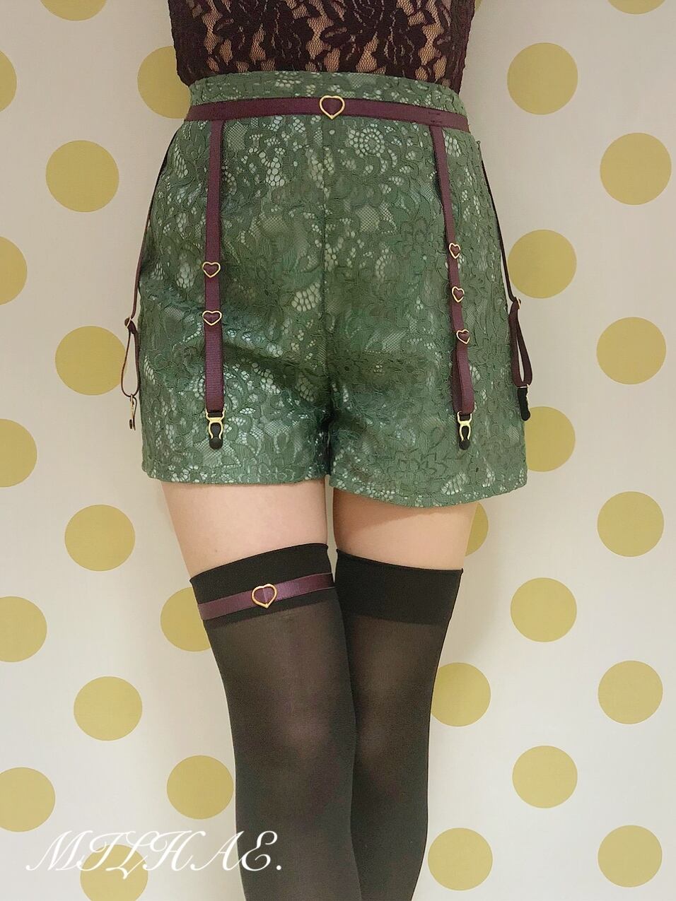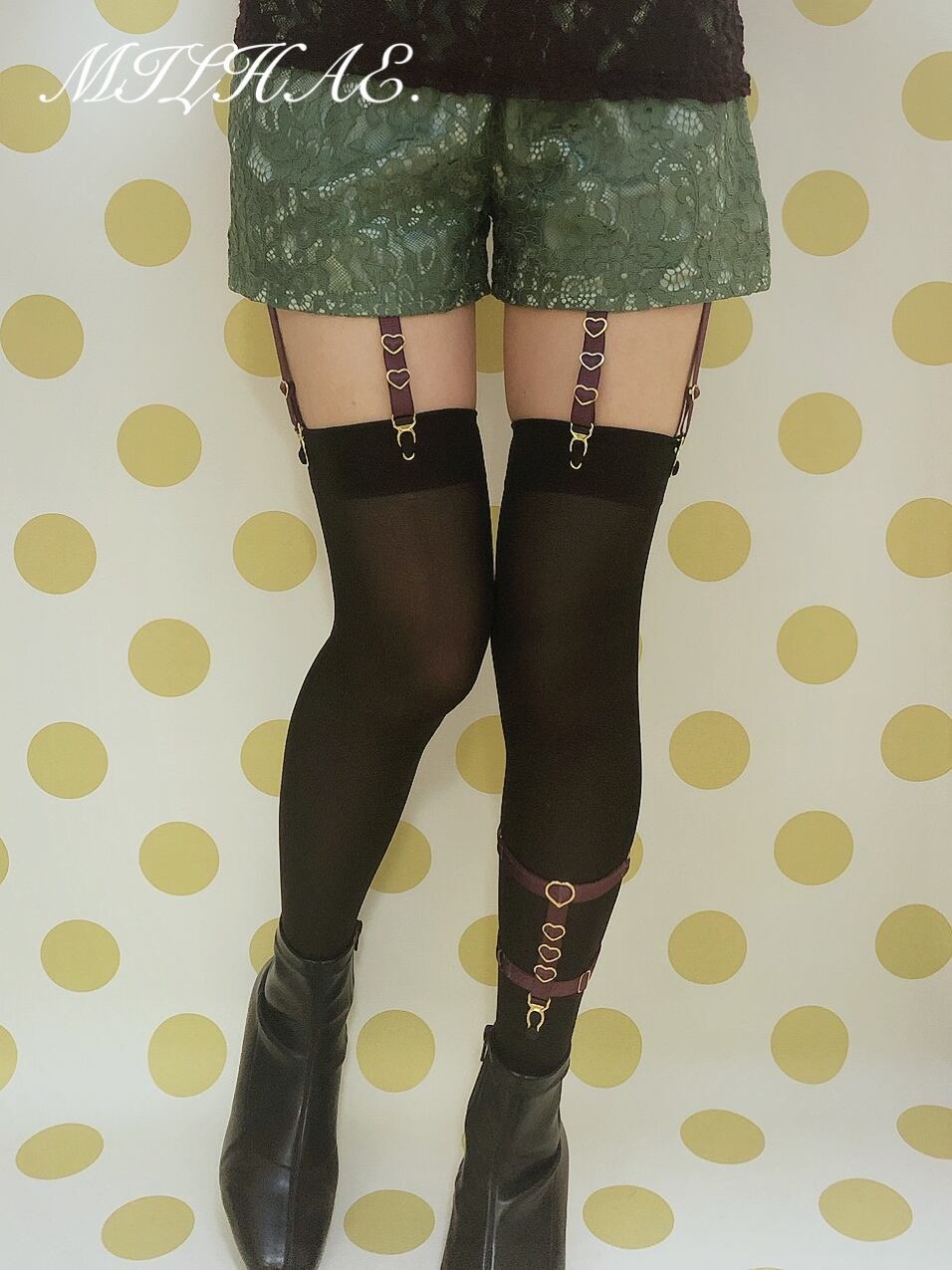 アシンメトリーに施されたハートが可愛らしく、フェティッシュなガーターベルト。