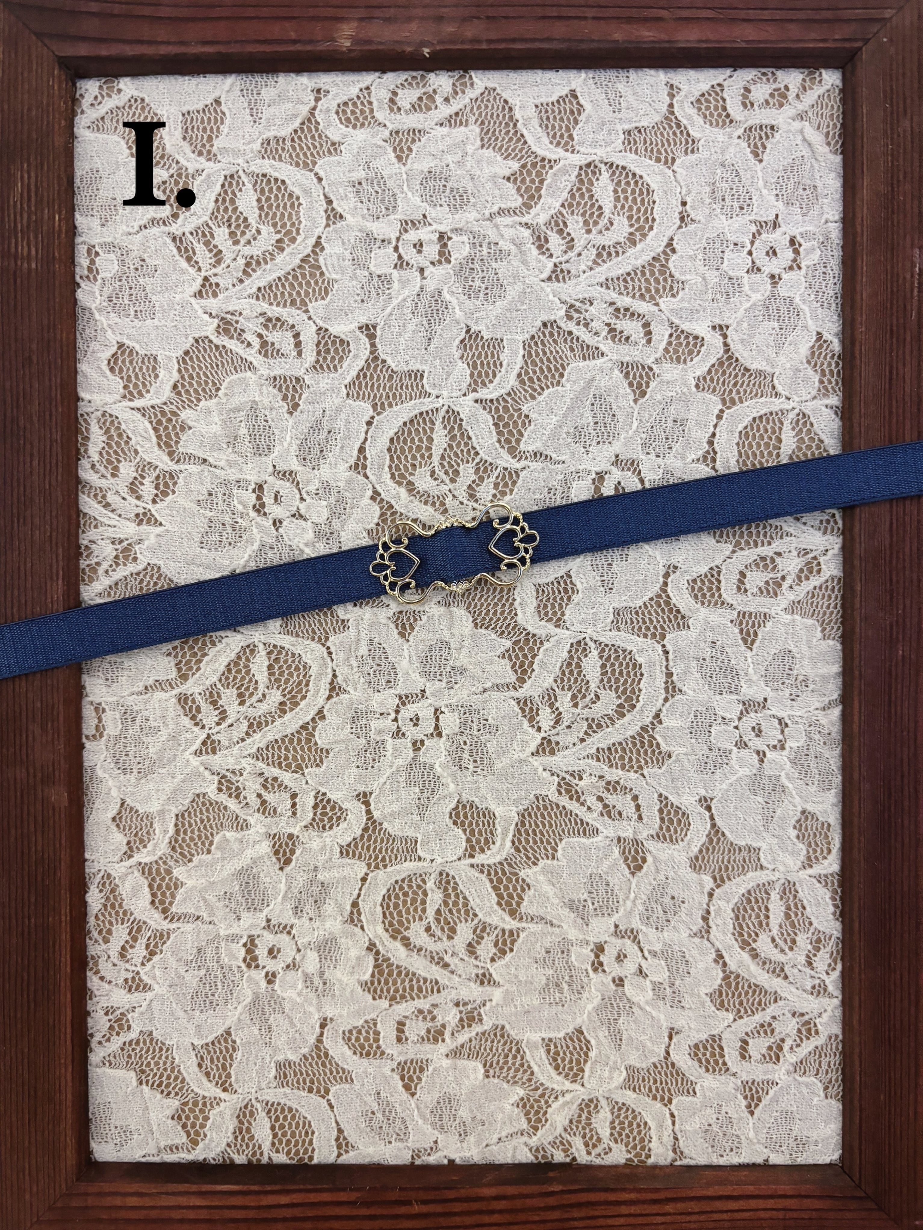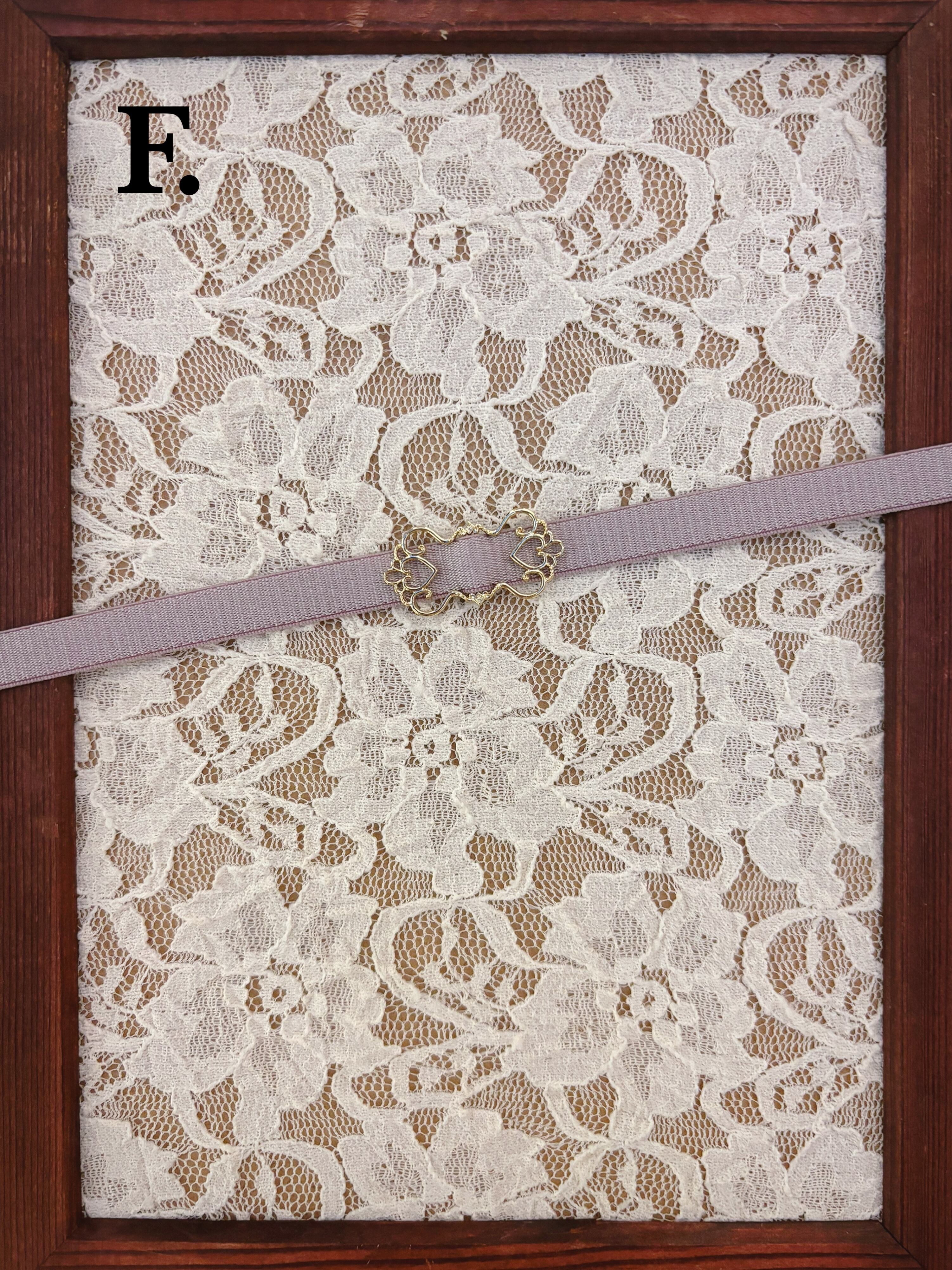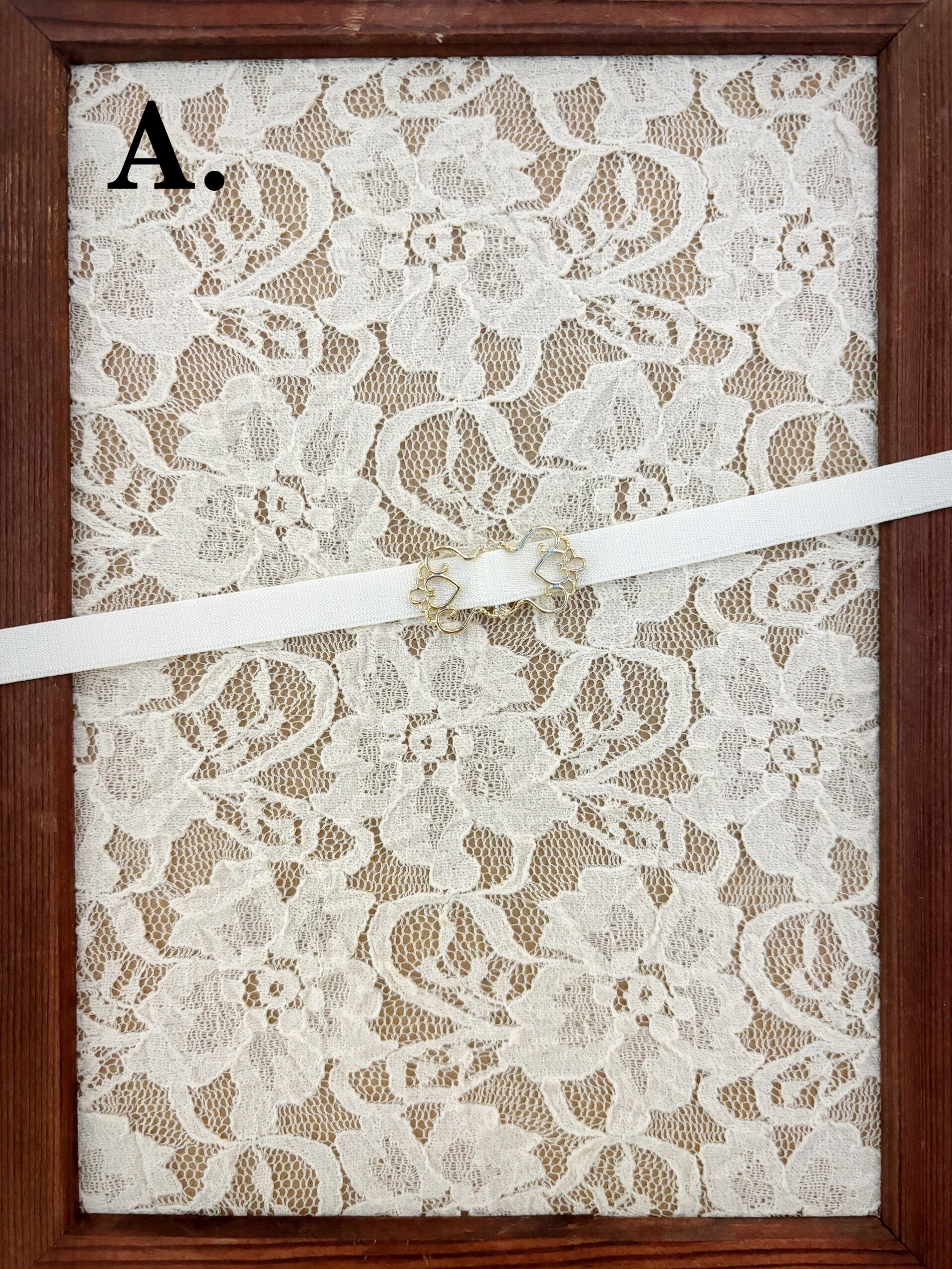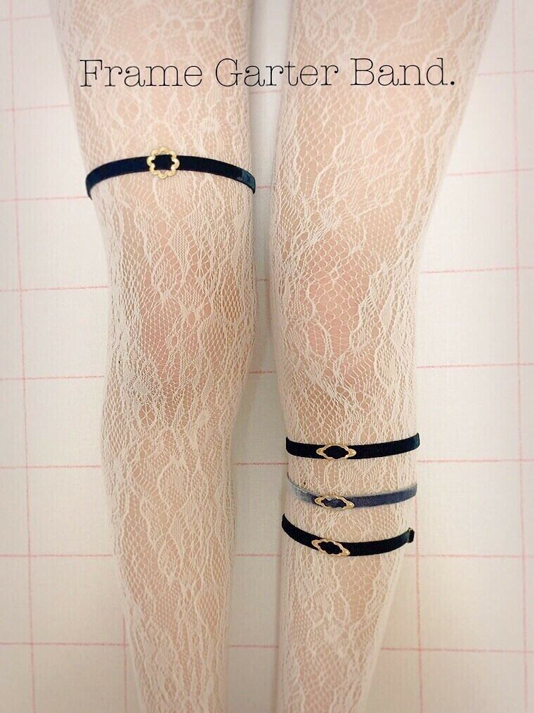不思議なカタチの額縁が足もとを装飾してくれるガーターバンド。