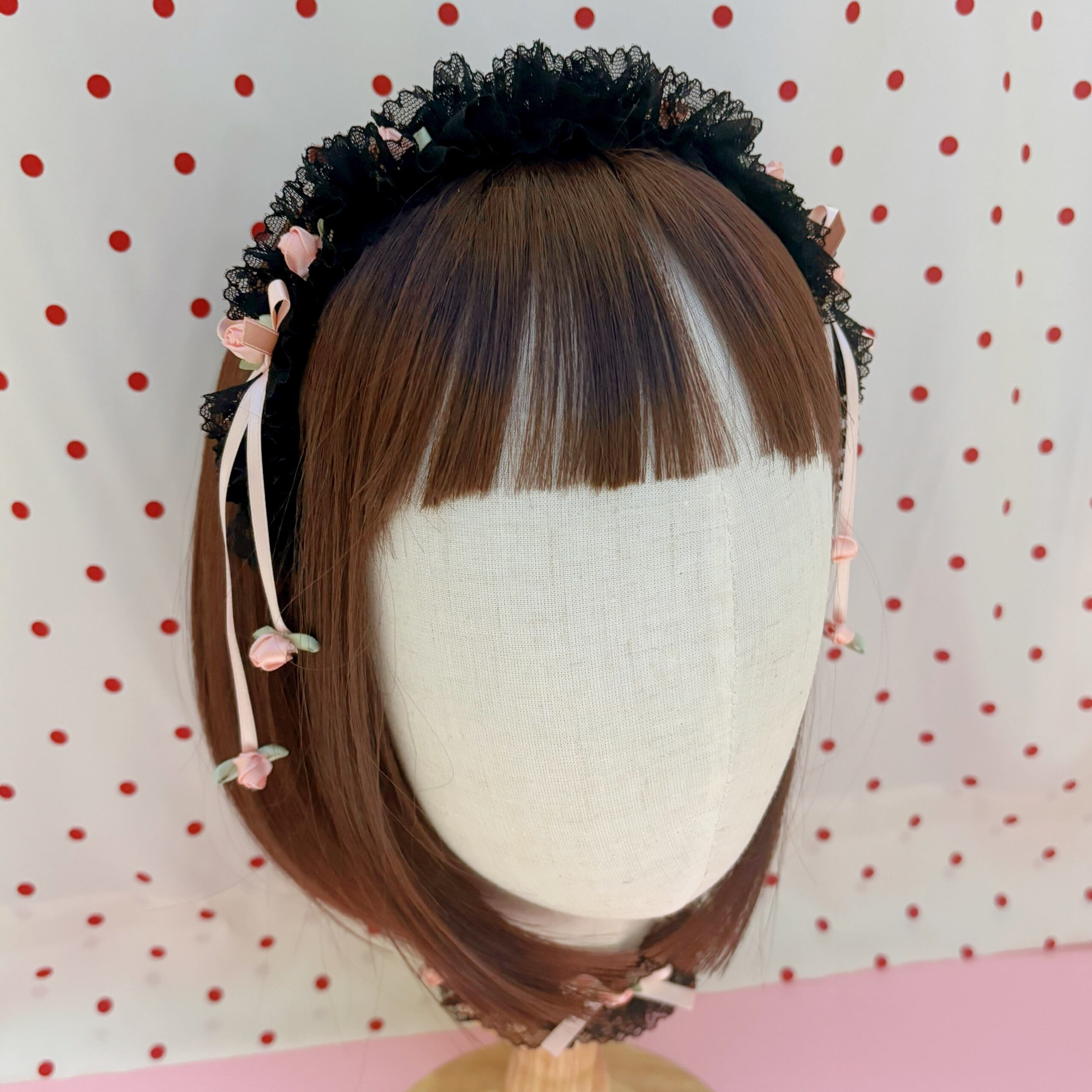 サイドから垂れる薔薇モチーフが顔周りで揺れる、可愛らしいデザイン。